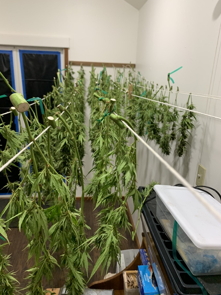 This was a clean trim. No more mold found. But in the future, if you see any buds hanging in my drying room with plant tape still attached to the top, that is likely a flower that had mold removed, and requires special handling and inspection. In the case of the plant tape in this photo, it was simply not cut off by me prior to hanging. Like I said, the first plant is for removing our rust with the process. Green tape should be removed during the trim.
