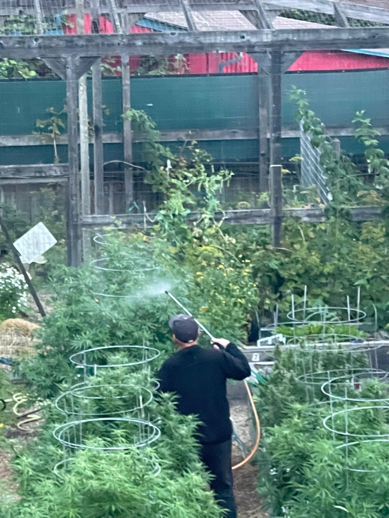 We’re up to four foliar sprays a week, but now we have a new foliar spray that we must work in proactively, and that is BT. Once your cannabis garden flowers, it is worm season. This is a slightly tricky spray, because it does not interact well with one of my other sprays, Regalia. I’ll need to skip a week of Regalia and let that week be devoted to worm control. I’ll probably have to do this at least twice. That means a period of time with some pathogenic vulnerability. Any new powdery mildew evidence will need to be removed from the beds and not allowed to spread, and it will be a hands-on fight until Regalia can be applied again. It then becomes a bit of a dance for the remainder of the grow. This is where I consult my weather charts often, specifically for any changes in humidity, which is the driving force in pathogens. If humidity remains high, we spray for powdery mildew and inspect for worms. When the humidity dips for a few days, we spray for worms and inspect for powdery mildew.