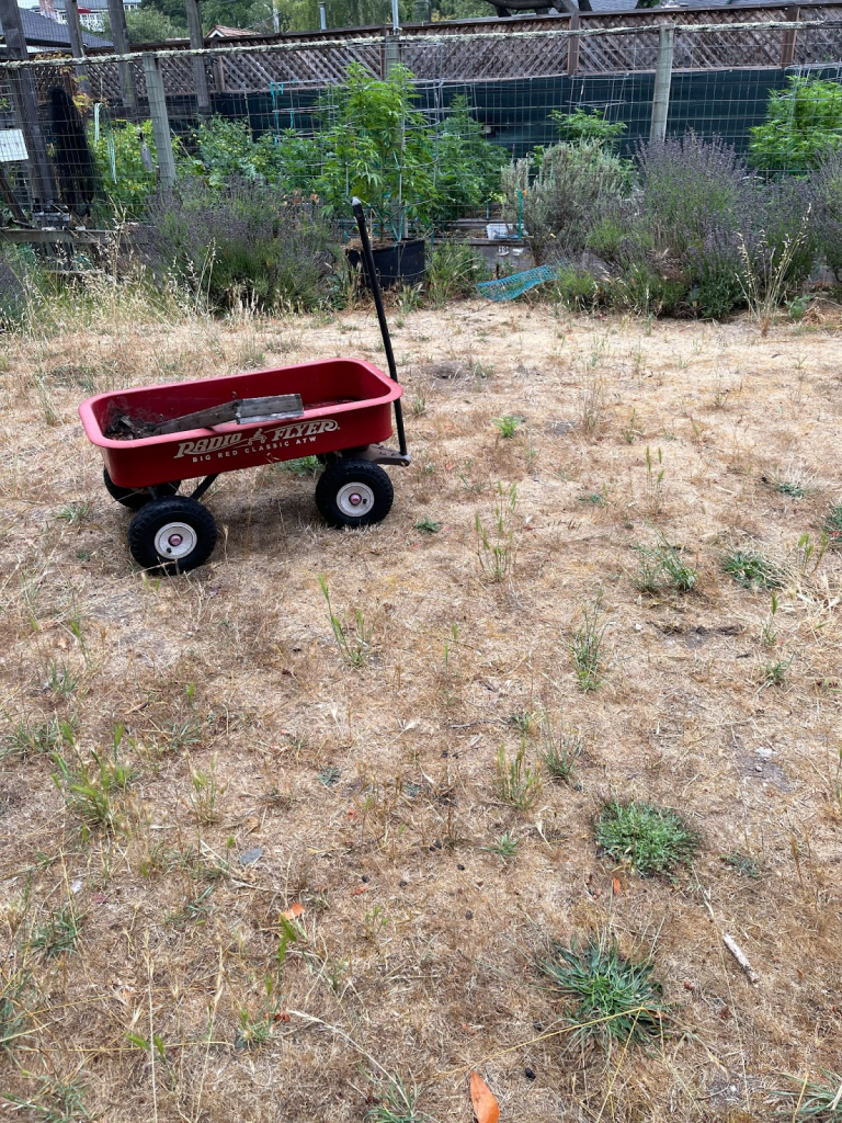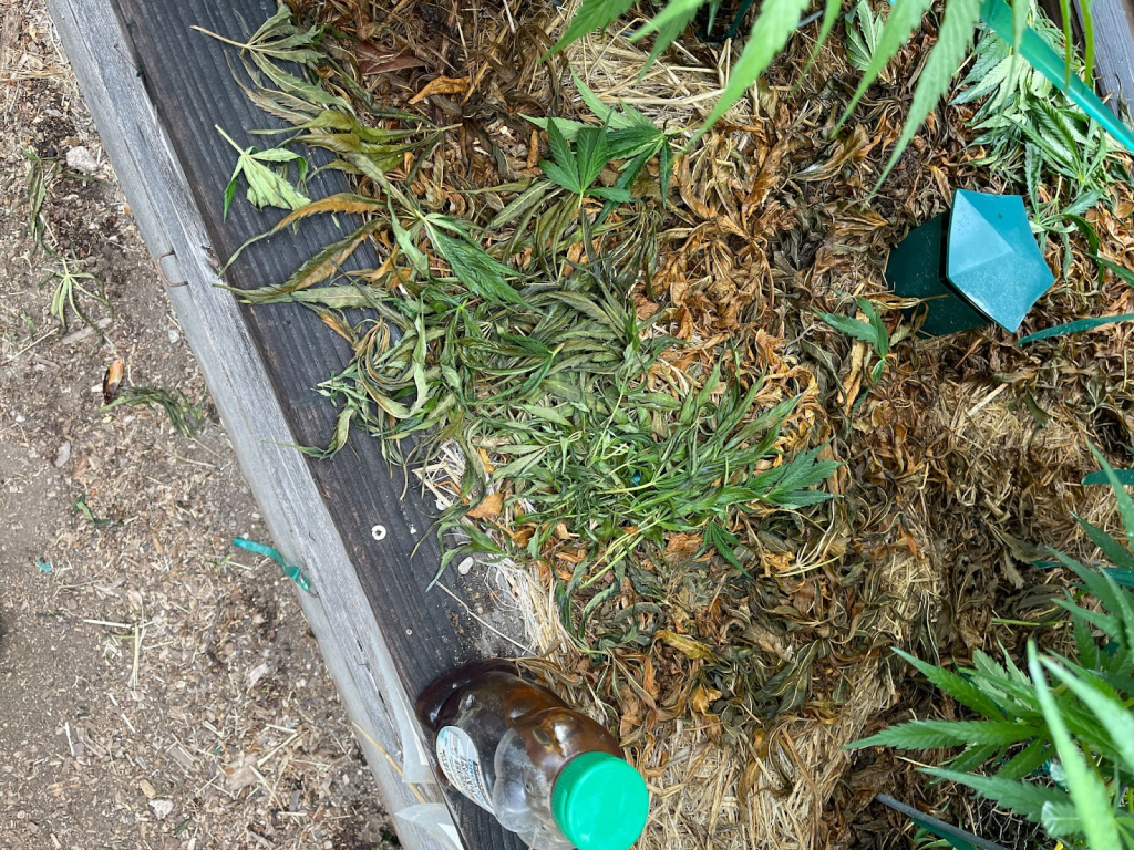 It’s a flowering garden now, and everything I do from this point forward is to aid the development and potential strength of those flowers. Because they are starting earlier, there is a much greater chance for each plant to actually reach their projected harvest date. This has never been my number one priority, but it’s nice when it happens, and now I am becoming curious about upcoming test scores. The only cannabis plants that get water now are the two in cloth bags and watering will be minimal even for those plants. The plants in beds will now only get a quart of tea for each of the next four weeks, before being given nothing but foliar sprays for the last month. Of course, Cherry Punch in bed 15 hasn’t received any water other than what’s in the weekly compost tea, since May 25. She shows no signs of stress, only vigorous flowering.