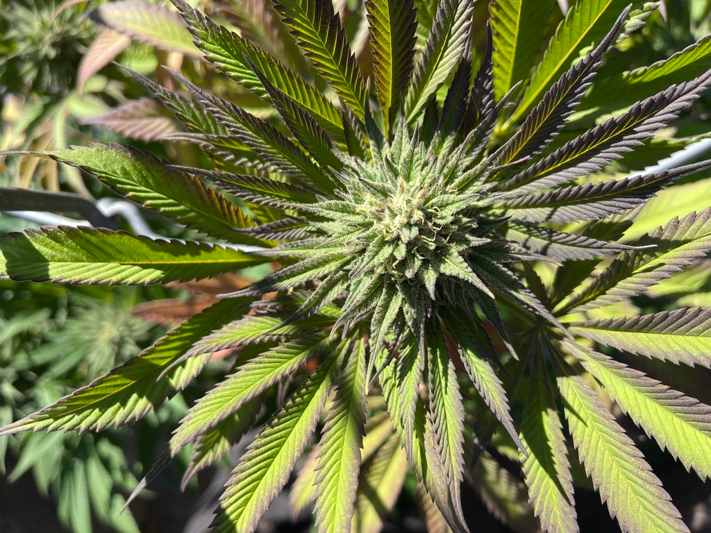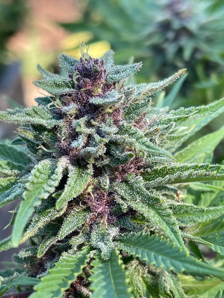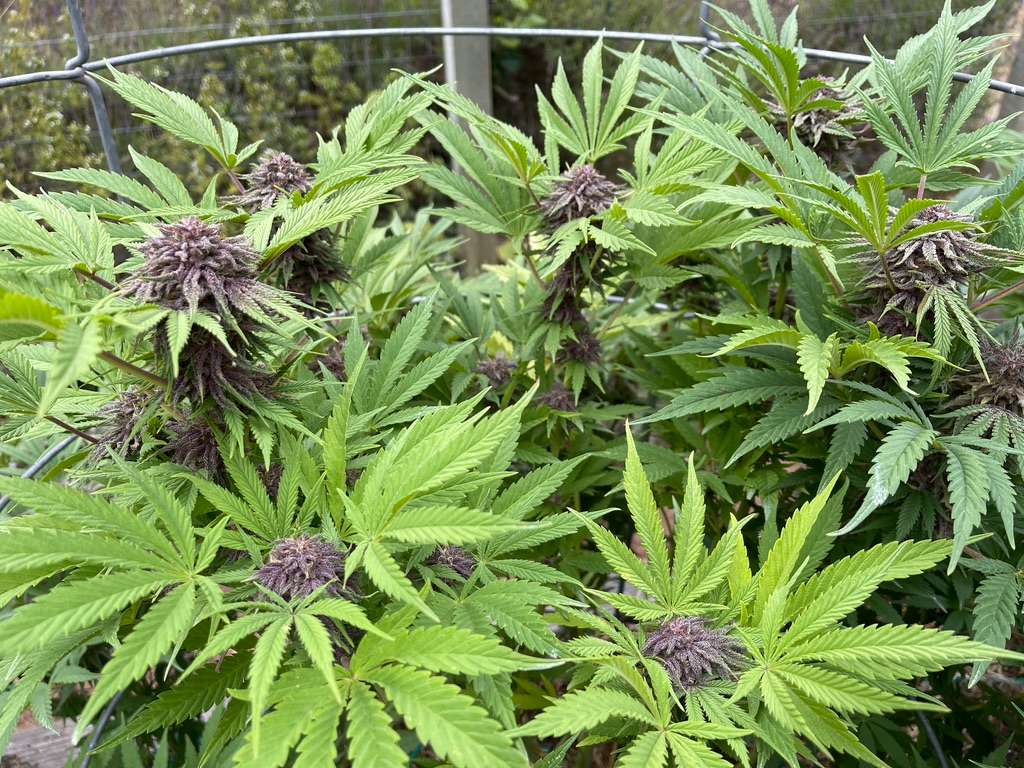 Plant inspection is now paramount. Once a day is the bare minimum, but I prefer two full plant inspections, because a lot can change between morning and evening. I also prefer one inspection in the sun and one in the shade. You notice different things depending on the conditions. Powdery mildew is best inspected in diffuse lighting. The white shades of the pathogen pop when there is no direct light. You can see mold in both conditions, though I find mold easier to spot in direct sunlight because of the brown color. Sunlight definitely helps when inspecting for mold on Fruitcake. With her deep purples and greens, I need the sun to differentiate the colors. Where mold exists within her colors, the brown and purple tend to blend. It makes for a challenging inspection.